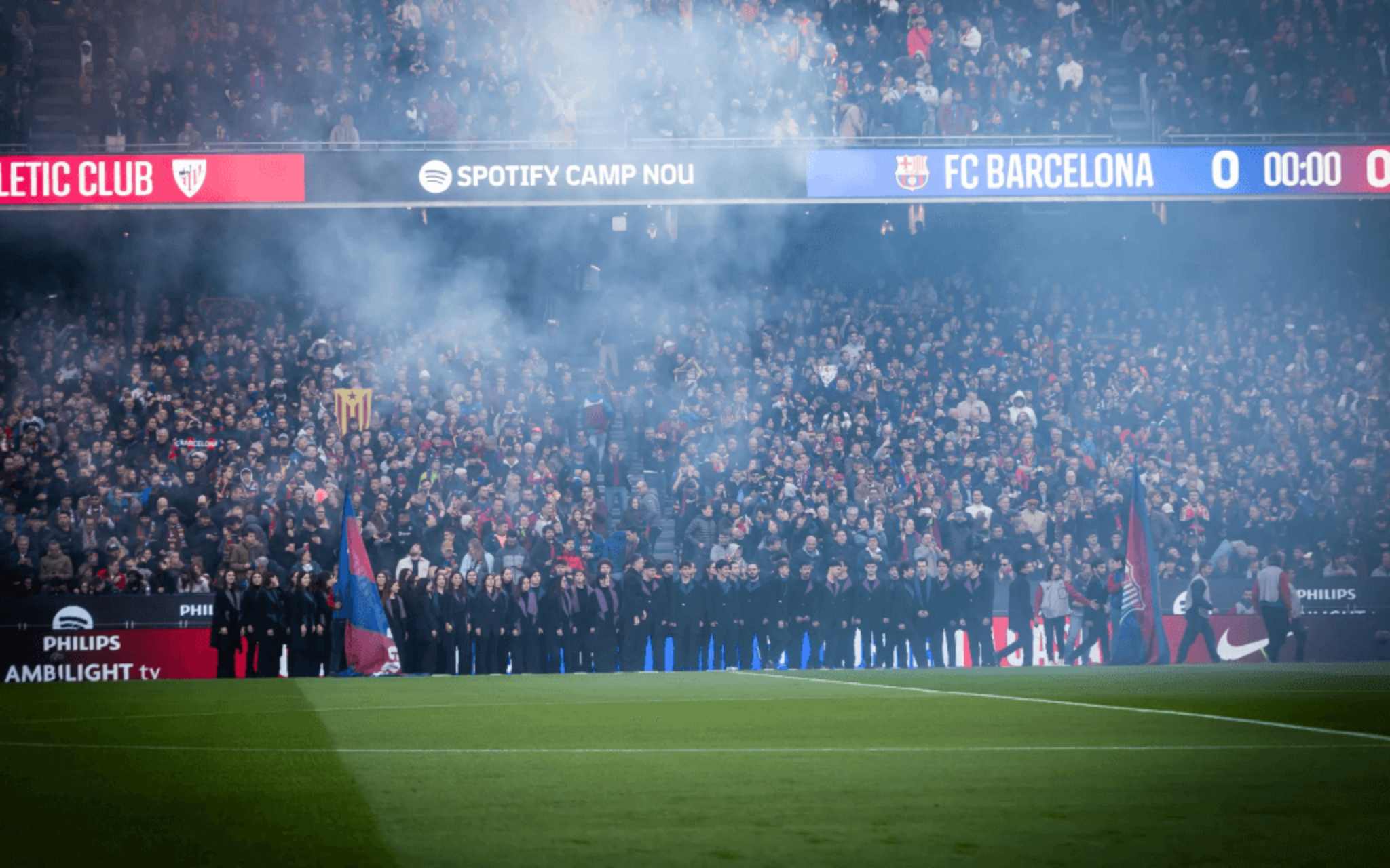 例如,这是45,157名巴萨球迷首次在新球场现场观看巴萨对阵竞技的比赛。他们为守门员们送上了第一阵掌——胡安·加西亚、什琴斯尼和科亨——他们率先出来热身,先于队友——场上球员。此外,比赛开始前,加泰罗尼亚乐团演唱了第一首国歌,首场开球仪式成为最特别的时刻之一。